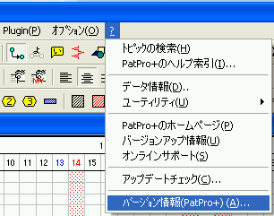 PatPro+を起動し、メニューバー「?」 ⇒ 「バージョン情報」をクリックす。